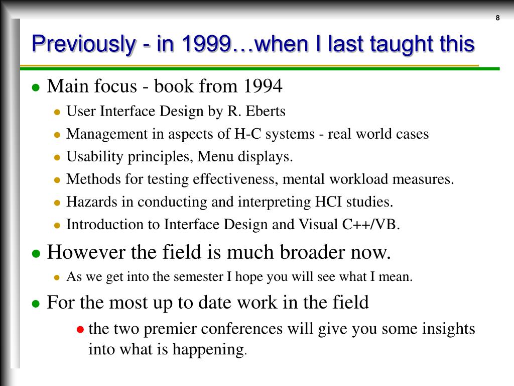 Previously - in 1999…when I last taught this • Main focus - book from 1994 • User Interface Design by R. Eberts • Management in aspects of H-C systems - real world cases • Usability principles, Menu displays. • Methods for testing effectiveness, mental workload measures. • Hazards in conducting and interpreting HCI studies. • Introduction to Interface Design and Visual C++/VB. • However the field is much broader now. • As we get into the semester I hope you will see what I mean. • For the most up to date work in the field • the two premier conferences will give you some insights into what is happening.