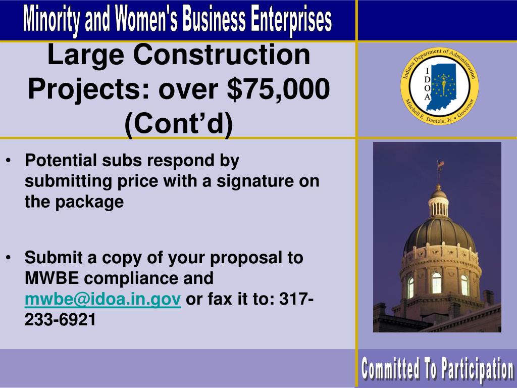 Minority and Women's Business Enterprises Large Construction Projects: over $75,000 (Cont’d) • Potential subs respond by submitting price with a signature on the package • Submit a copy of your proposal to MWBE compliance and mwbe@idoa.in.gov or fax it to: 317-233-6921 Committed To Participation