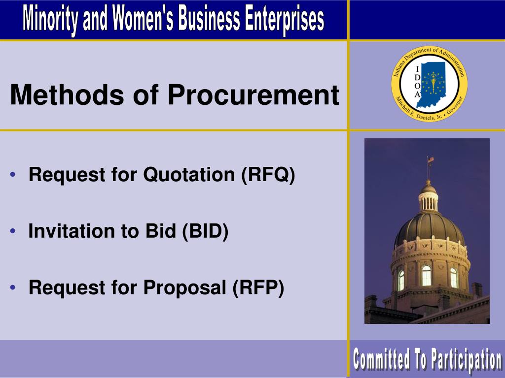 Minority and Women's Business Enterprises Methods of Procurement • Request for Quotation (RFQ) • Invitation to Bid (BID) • Request for Proposal (RFP) Committed To Participation