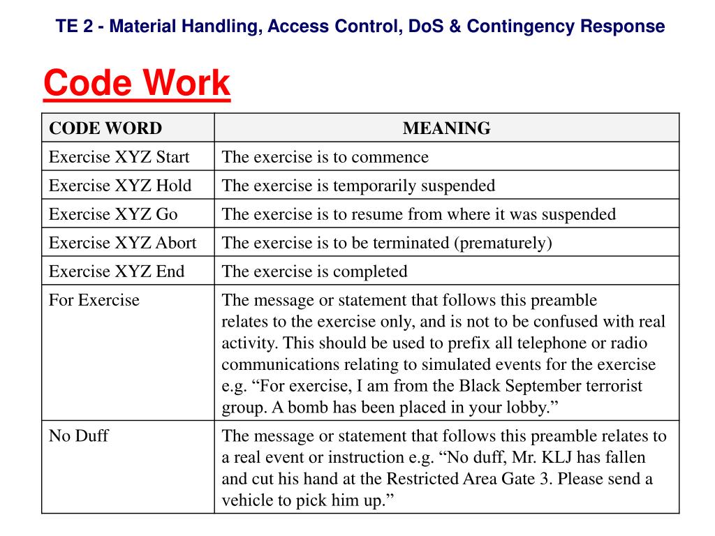 XYZ Port Facility Maritime Security Exercise. Date : dd-mm-yyyy. Port Facility Tabletop Exercise. Material Handling, Access Control, DoS and Contingency Response Exercise TE 2. Scope. Schedule Aim Objectives Desired Outcomes Logistic Information Scenario Debrief. For Controllers Only