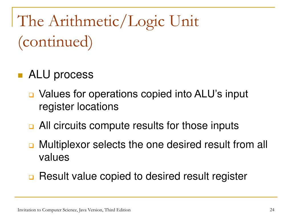 The Arithmetic/Logic Unit (continued) • ALU process • Values for operations copied into ALU’s input register locations • All circuits compute results for those inputs • Multiplexor selects the one desired result from all values • Result value copied to desired result register Invitation to Computer Science, Java Version, Third Edition