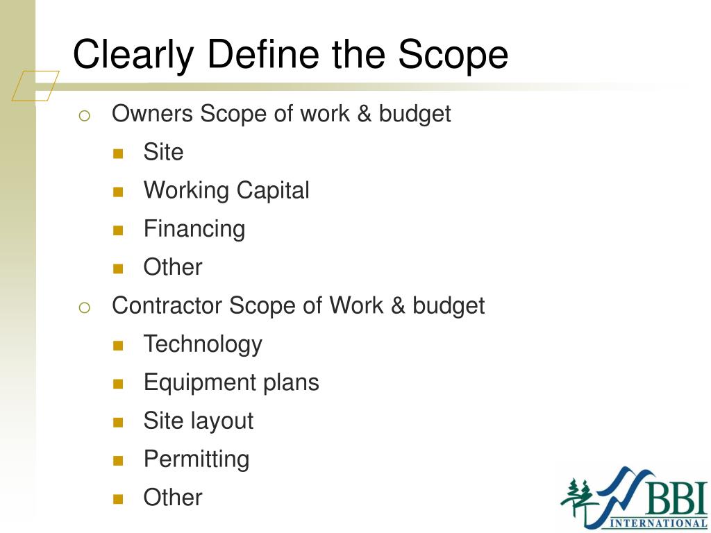 Clearly Define the Scope • Owners Scope of work & budget • Site • Working Capital • Financing • Other • Contractor Scope of Work & budget • Technology • Equipment plans • Site layout • Permitting • Other