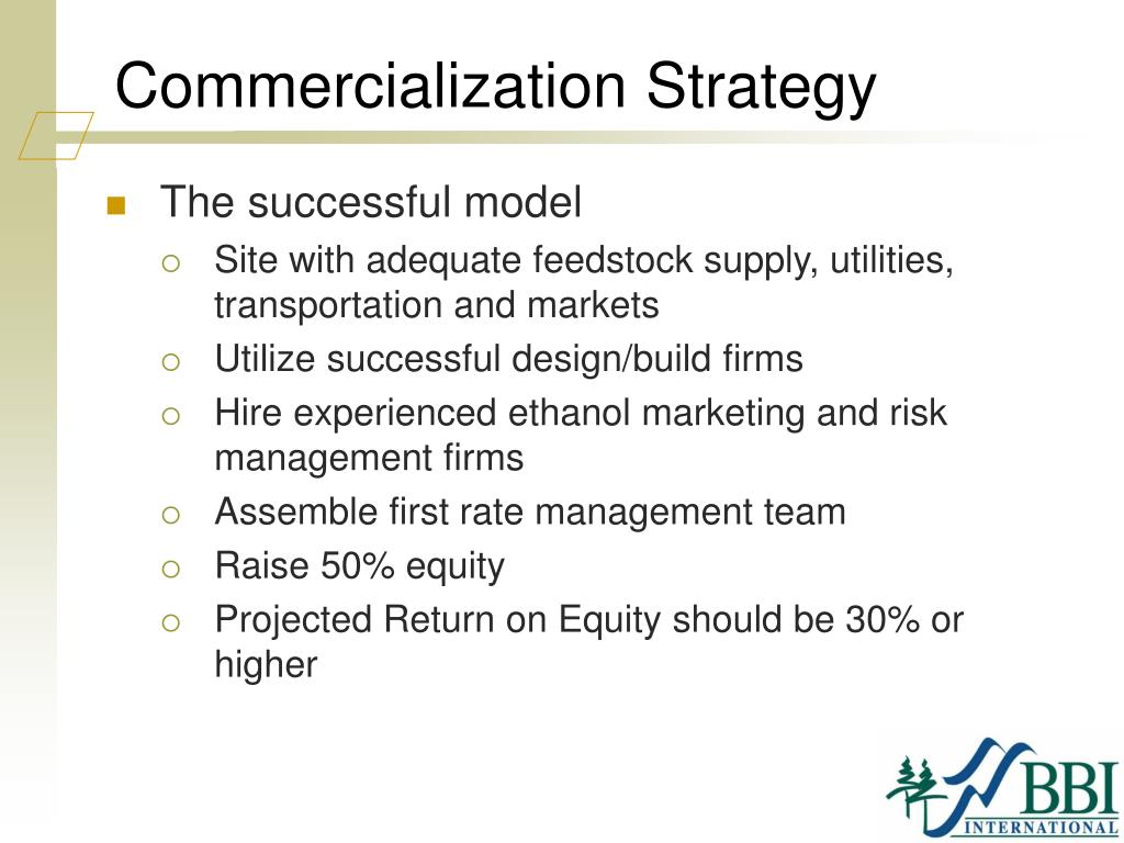 Commercialization Strategy • The successful model • Site with adequate feedstock supply, utilities, transportation and markets • Utilize successful design/build firms • Hire experienced ethanol marketing and risk management firms • Assemble first rate management team • Raise 50% equity • Projected Return on Equity should be 30% or higher