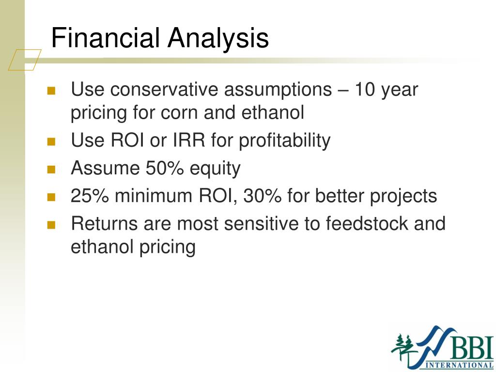 Financial Analysis • Use conservative assumptions – 10 year pricing for corn and ethanol • Use ROI or IRR for profitability • Assume 50% equity • 25% minimum ROI, 30% for better projects • Returns are most sensitive to feedstock and ethanol pricing