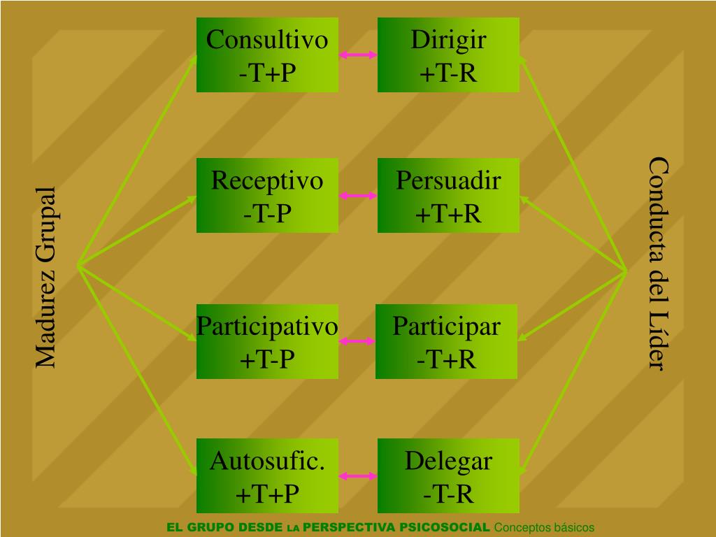 Madurez Grupal Conducta del Líder Consultivo -T+P Dirigir +T-R Receptivo -T-P Persuadir +T+R Participativo +T-P Participar -T+R Autosufic. +T+P Delegar -T-R