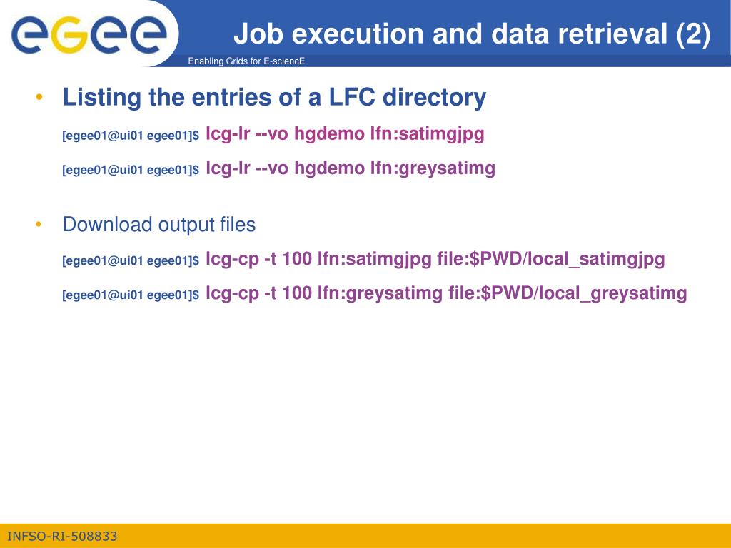 Job execution and data retrieval (2) Listing the entries of a LFC directory [egee01@ui01 egee01]$lcg-lr --vo hgdemo lfn:satimgjpg [egee01@ui01 egee01]$ lcg-lr --vo hgdemo lfn:greysatimg Download output files [egee01@ui01 egee01]$lcg-cp -t 100 lfn:satimgjpg file:$PWD/local_satimgjpg [egee01@ui01 egee01]$lcg-cp -t 100 lfn:greysatimg file:$PWD/local_greysatimg