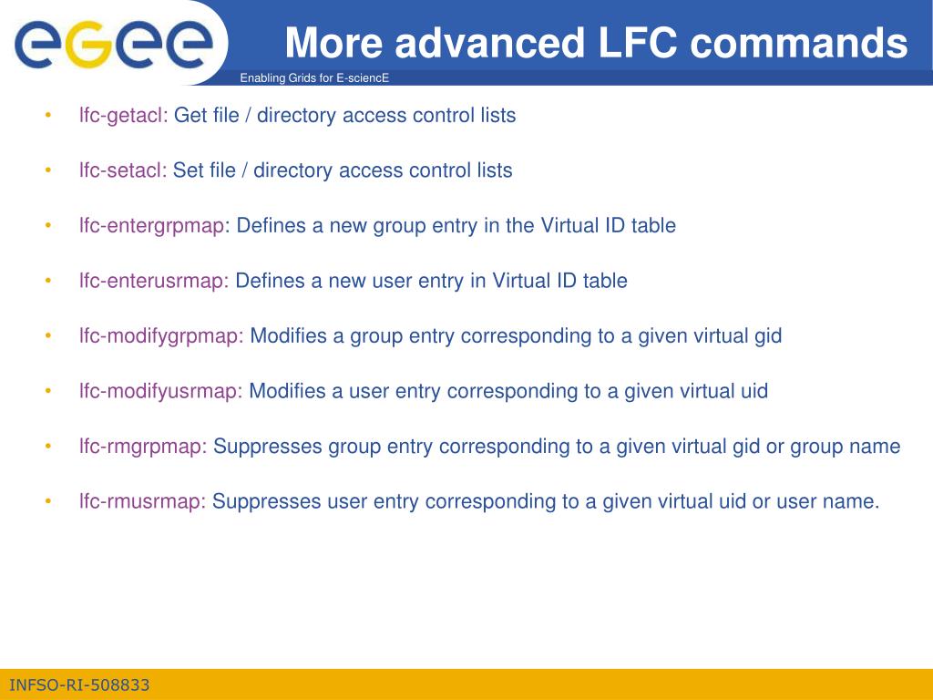 More advanced LFC commands lfc-getacl: Get file/directory access control lists lfc-setacl: Set file/directory access control lists lfc-entergrpmap: Defines a new group entry in the Virtual ID table lfc-enterusrmap: Defines a new user entry in Virtual ID table lfc-modifygrpmap: Modifies a group entry corresponding to a given virtual gid lfc-modifyusrmap: Modifies a user entry corresponding to a given virtual uid lfc-rmgrpmap: Suppresses group entry corresponding to a given virtual gid or group name lfc-rmusrmap: Suppresses user entry corresponding to a given virtual uid or user name.