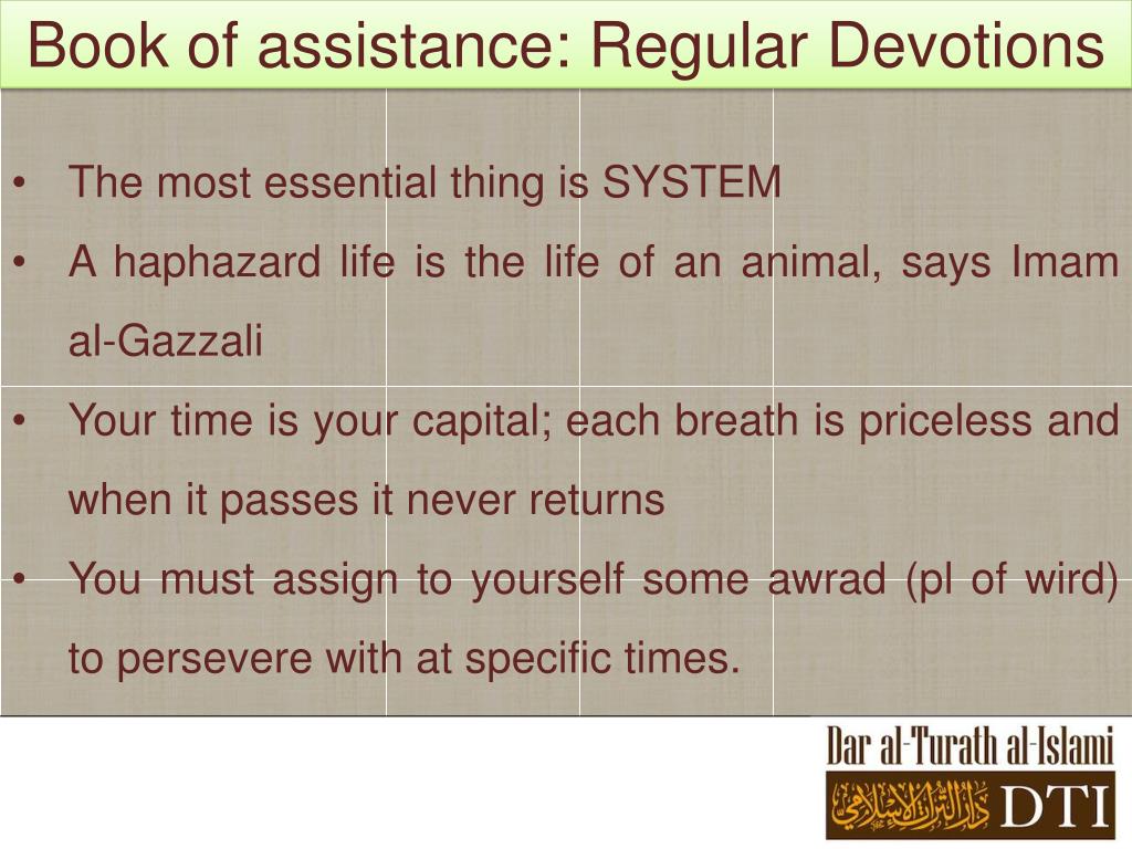Book of assistance: Regular Devotions • The most essential thing is SYSTEM • A haphazard life is the life of an animal, says Imam al-Gazzali • Your time is your capital; each breath is priceless and when it passes it never returns • You must assign to yourself some awrad (pl of wird) to persevere with at specific times.