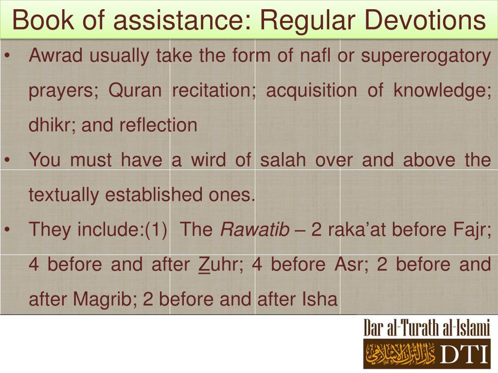 Book of assistance: Regular Devotions • Awrad usually take the form of nafl or supererogatory prayers; Quran recitation; acquisition of knowledge; dhikr; and reflection • You must have a wird of salah over and above the textually established ones. • They include:(1) The Rawatib – 2 raka’at before Fajr; 4 before and after Zuhr; 4 before Asr; 2 before and after Magrib; 2 before and after Isha
