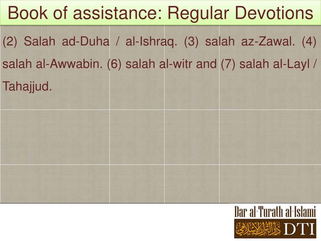 Book of assistance: Regular Devotions (2) Salah ad-Duha / al-Ishraq. (3) salahaz-Zawal. (4) salah al-Awwabin. (6) salah al-witr and (7) salah al-Layl / Tahajjud.