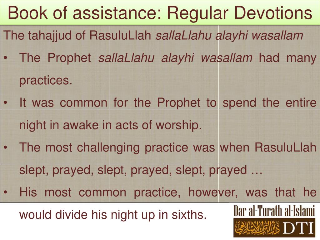 Book of assistance: Regular Devotions • The tahajjud of RasuluLlahsallaLlahualayhiwasallam • The Prophet sallaLlahualayhiwasallamhad many practices. • It was common for the Prophet to spend the entire night in awake in acts of worship. • The most challenging practice was when RasuluLlah slept, prayed, slept, prayed, slept, prayed … • His most common practice, however, was that he would divide his night up in sixths.