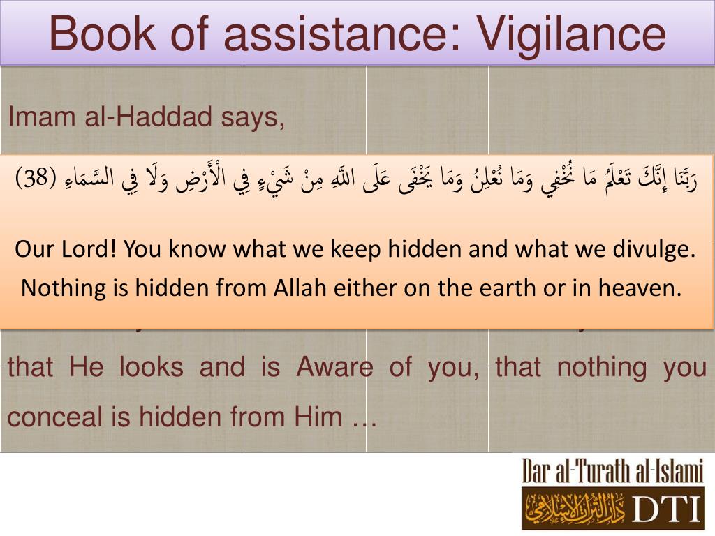 Book of assistance: Vigilance Imam al-Haddad says, You must, O my brothers/sisters, be mindful of Allah in your movements and times of stillness, at every moment, with every blink of the eye, with every thought, wish or any other state. Feel His nearness to you! Know that He looks and is Aware of you, that nothing you conceal is hidden from Him … رَبَّنَا إِنَّكَ تَعْلَمُ مَا نُخْفِي وَمَا نُعْلِنُ وَمَا يَخْفَى عَلَى اللَّهِ مِنْ شَيْءٍ فِي الْأَرْضِ وَلَا فِي السَّمَاءِ (38) Our Lord! You know what we keep hidden and what we divulge. Nothing is hidden from Allah either on the earth or in heaven.