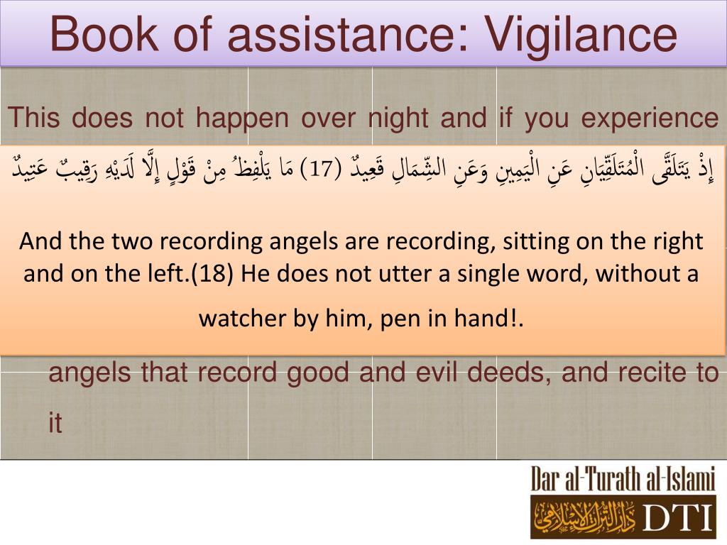 Book of assistance: Vigilance This does not happen over night and if you experience laziness or inclination to disobedience then Remind yourself that Allah hears and sees you and knows your secrets If this does not work … remind it of the two noble angels that record good and evil deeds, and recite to it إِذْ يَتَلَقَّى الْمُتَلَقِّيَانِ عَنِ الْيَمِينِ وَعَنِ الشِّمَالِ قَعِيدٌ (17) مَا يَلْفِظُ مِنْ قَوْلٍ إِلَّا لَدَيْهِ رَقِيبٌ عَتِيدٌ And the two recording angels are recording, sitting on the right and on the left.(18) He does not utter a single word, without a watcher by him, pen in hand!. وَإِنْ تَجْهَرْ بِالْقَوْلِ فَإِنَّهُ يَعْلَمُ السِّرَّ وَأَخْفَى Though you speak out loud, He knows your secrets and what is even more concealed.