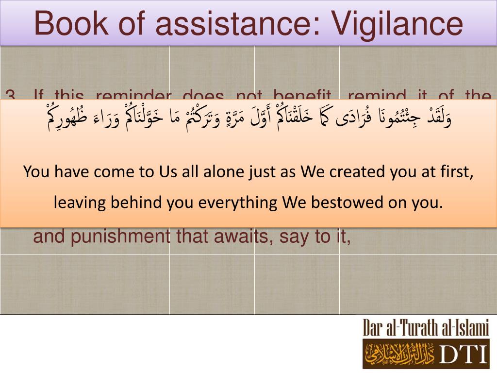 Book of assistance: Vigilance If this reminder does not benefit, remind it of the proximity of death, that it is the nearest of all hidden and awaited things If this reminder is of no use, remind it of the reward and punishment that awaits, say to it, وَلَقَدْ جِئْتُمُونَا فُرَادَى كَمَا خَلَقْنَاكُمْ أَوَّلَ مَرَّةٍ وَتَرَكْتُمْ مَا خَوَّلْنَاكُمْ وَرَاءَ ظُهُورِكُمْ You have come to Us all alone just as We created you at first, leaving behind you everything We bestowed on you.