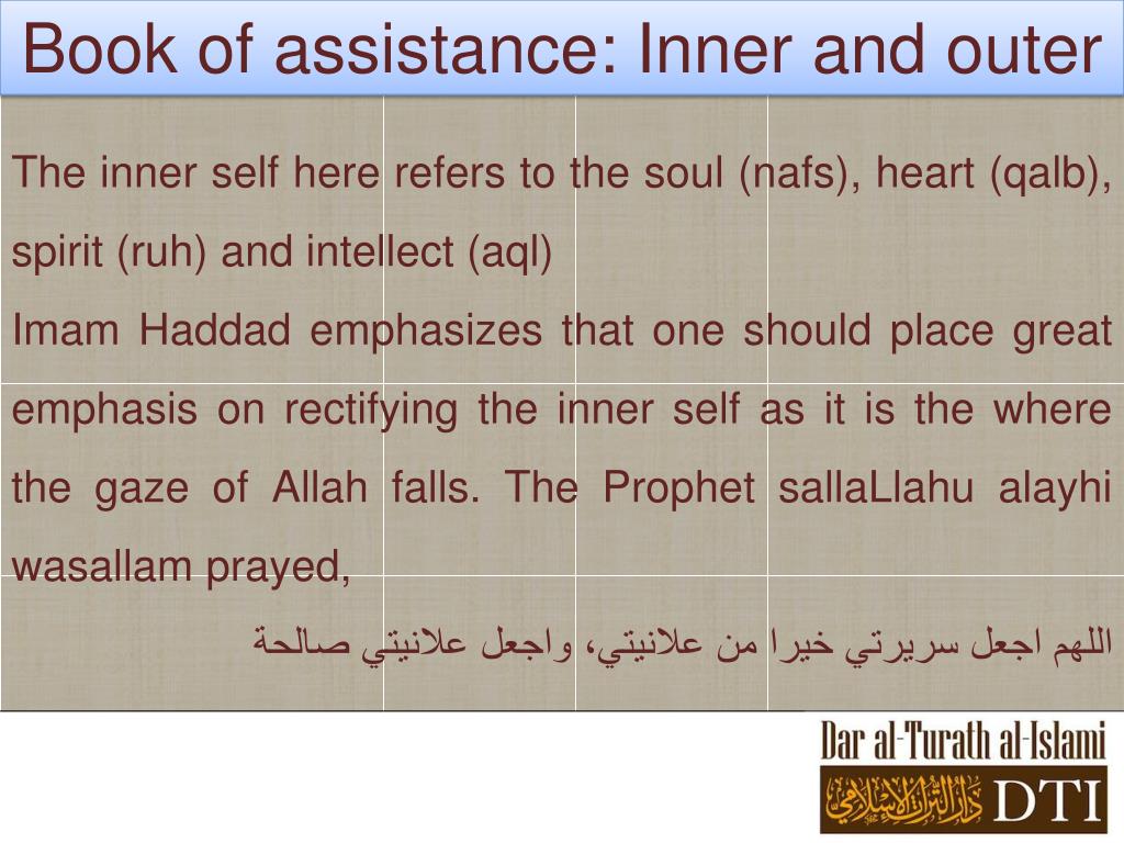 Book of assistance: Inner and outer The inner self here refers to the soul (nafs), heart (qalb), spirit (ruh) and intellect (aql) Imam Haddad emphasizes that one should place great emphasis on rectifying the inner self as it is the where the gaze of Allah falls. The Prophet sallaLlahualayhiwasallam prayed, اللهم اجعل سريرتي خيرا من علانيتي، واجعل علانيتي صالحة