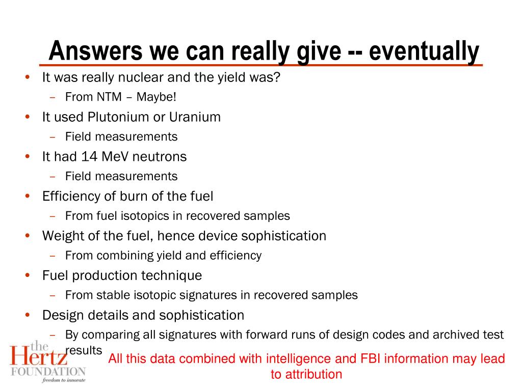Answers we can really give -- eventually • It was really nuclear and the yield was? • From NTM – Maybe! • It used Plutonium or Uranium • Field measurements • It had 14 MeV neutrons • Field measurements • Efficiency of burn of the fuel • From fuel isotopics in recovered samples • Weight of the fuel, hence device sophistication • From combining yield and efficiency • Fuel production technique • From stable isotopic signatures in recovered samples • Design details and sophistication • By comparing all signatures with forward runs of design codes and archived test results All this data combined with intelligence and FBI information may lead to attribution