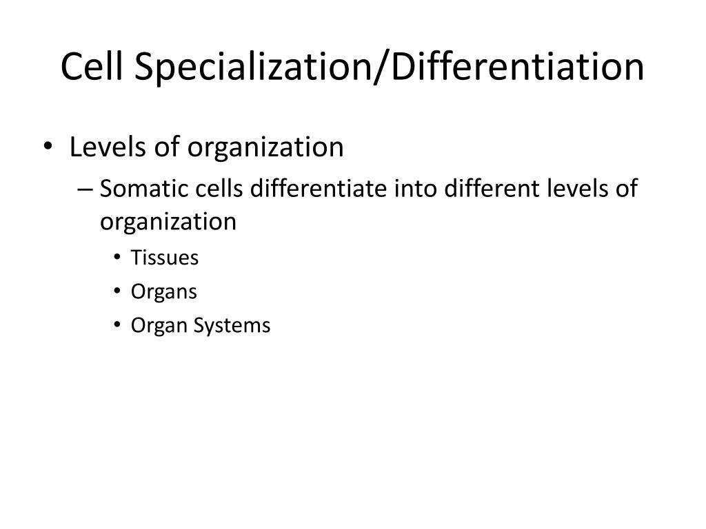 Cell Specialization/Differentiation • Levels of organization • Somatic cells differentiate into different levels of organization • Tissues • Organs • Organ Systems