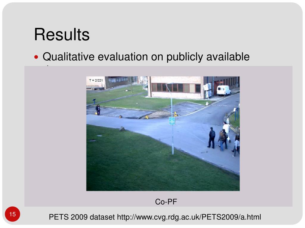 Results • Qualitative evaluation on publicly available dataset Co-PF PETS 2009 dataset http://www.cvg.rdg.ac.uk/PETS2009/a.html