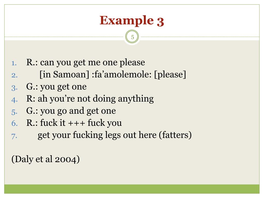 Example 3 • R.: can you get me one please • [in Samoan] :fa’amolemole: [please] • G.: you get one • R: ah you’re not doing anything • G.: you go and get one • R.: fuck it +++ fuck you • get your fucking legs out here (fatters) (Daly et al 2004)