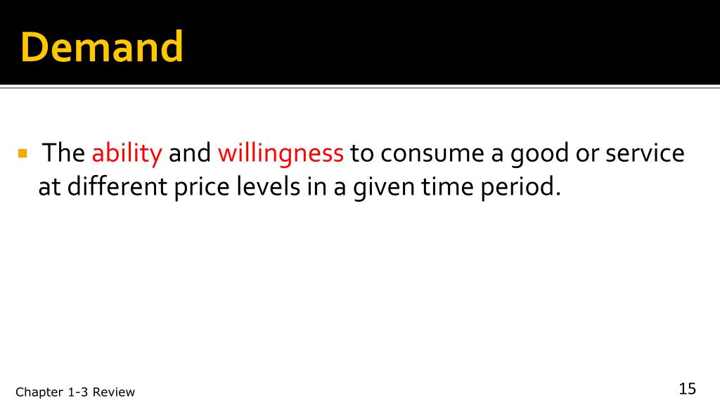Demand • The ability and willingness to consume a good or service at different price levels in a given time period. Chapter 1-3 Review 15