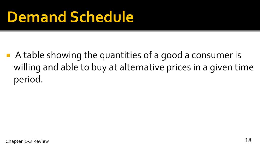 Demand Schedule • A table showing the quantities of a good a consumer is willing and able to buy at alternative prices in a given time period. Chapter 1-3 Review 18