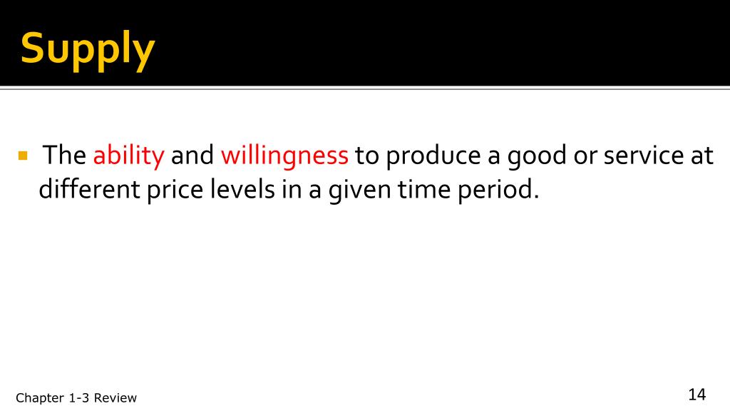 Supply • The ability and willingness to produce a good or service at different price levels in a given time period. Chapter 1-3 Review 14