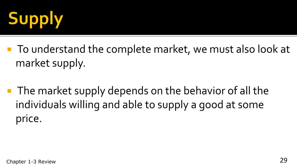 Supply • To understand the complete market, we must also look at market supply. • The market supply depends on the behavior of all the individuals willing and able to supply a good at some price. Chapter 1-3 Review 29