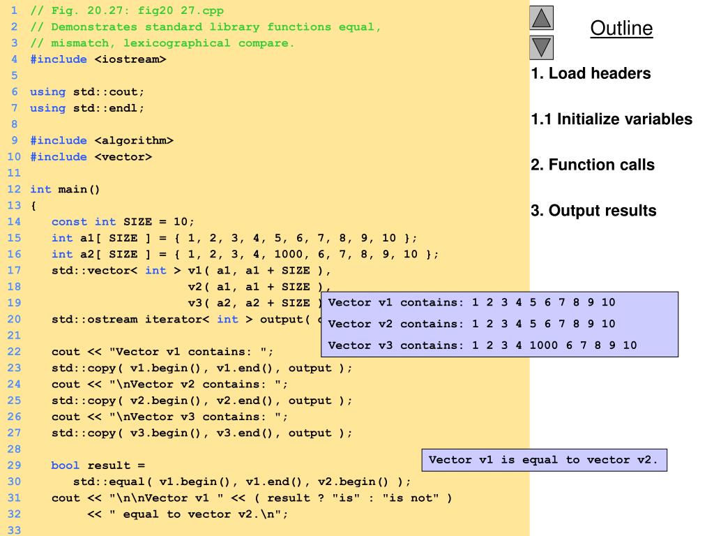 1 // Fig. 20.27: fig20_27.cpp 2 // Demonstrates standard library functions equal, 3 // mismatch, lexicographical_compare. 4 #include <iostream> 5 6 using std::cout; 7 using std::endl; 8 9 #include <algorithm> 10 #include <vector> 11 12 int main() 13 { 14 const int SIZE = 10; 15 int a1[ SIZE ] = { 1, 2, 3, 4, 5, 6, 7, 8, 9, 10 }; 16 int a2[ SIZE ] = { 1, 2, 3, 4, 1000, 6, 7, 8, 9, 10 }; 17 std::vector< int > v1( a1, a1 + SIZE ), 18 v2( a1, a1 + SIZE ), 19 v3( a2, a2 + SIZE ); 20 std::ostream_iterator< int > output( cout, " " ); 21 22 cout << "Vector v1 contains: "; 23 std::copy( v1.begin(), v1.end(), output ); 24 cout << "\nVector v2 contains: "; 25 std::copy( v2.begin(), v2.end(), output ); 26 cout << "\nVector v3 contains: "; 27 std::copy( v3.begin(), v3.end(), output ); 28 29 bool result = 30 std::equal( v1.begin(), v1.end(), v2.begin() ); 31 cout << "\n\nVector v1 " << ( result ? "is" : "is not" ) 32 << " equal to vector v2.\n"; 33 1. Load headers 1.1 Initialize variables 2. Function calls 3. Output results Vector v1 contains: 1 2 3 4 5 6 7 8 9 10 Vector v2 contains: 1 2 3 4 5 6 7 8 9 10 Vector v3 contains: 1 2 3 4 1000 6 7 8 9 10 Vector v1 is equal to vector v2.