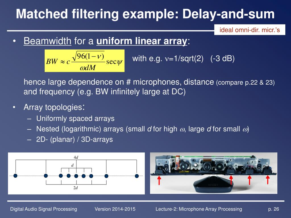 Matched filtering example: Delay-and-sum ideal omni-dir. micr.’s • Beamwidth for a uniform linear array: hence large dependence on # microphones, distance (compare p.22 & 23) and frequency (e.g. BW infinitely large at DC) • Array topologies: • Uniformly spaced arrays • Nested (logarithmic) arrays (small d for high , large d for small ) • 2D- (planar) / 3D-arrays with e.g.=1/sqrt(2) (-3 dB)