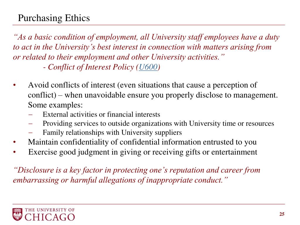 Purchasing Ethics “As a basic condition of employment, all University staff employees have a duty to act in the University’s best interest in connection with matters arising from or related to their employment and other University activities.” - Conflict of Interest Policy (U600) • Avoid conflicts of interest (even situations that cause a perception of conflict) – when unavoidable ensure you properly disclose to management. Some examples: • External activities or financial interests • Providing services to outside organizations with University time or resources • Family relationships with University suppliers • Maintain confidentiality of confidential information entrusted to you • Exercise good judgment in giving or receiving gifts or entertainment “Disclosure is a key factor in protecting one’s reputation and career from embarrassing or harmful allegations of inappropriate conduct.”