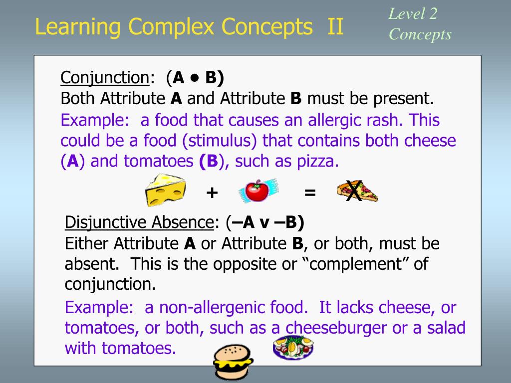 Level 2 Concepts Learning Complex Concepts II Disjunction: (A v B) Either A or B, or both, must be present. Example: an allergenic food that involves the same attributes as before—cheese (A) and tomatoes (B)—but either one alone can cause a rash, as well as both ingredients combined. So with this rule you would have to avoid cheeseburgers as well as pizza.