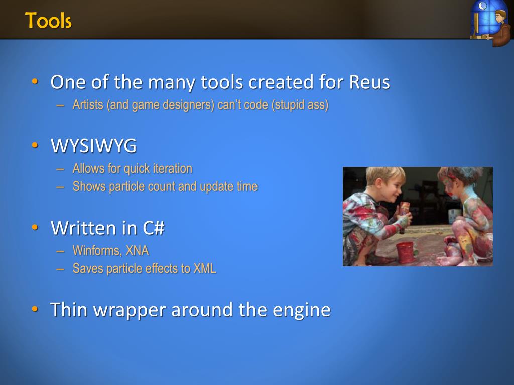 Tools • One of the many tools created for Reus • Artists (and game designers) can’t code (stupid ass) • WYSIWYG • Allows for quick iteration • Shows particle count and update time • Written in C# • Winforms, XNA • Saves particle effects to XML • Thin wrapper around the engine