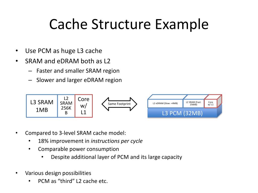 Cache Structure Example • Use PCM as huge L3 cache • SRAM and eDRAM both as L2 • Faster and smaller SRAM region • Slower and larger eDRAM region L3 SRAM1MB L2 SRAM256KB Corew/ L1 L2 eDRAM (Slow: <4MB) L2 SRAM (Fast: 256KB) Core w/ L1 Same Footprint L3 PCM (32MB) • Compared to 3-level SRAM cache model: • 18% improvement in instructions per cycle • Comparable power consumption • Despite additional layer of PCM and its large capacity • Various design possibilities • PCM as “third” L2 cache etc.