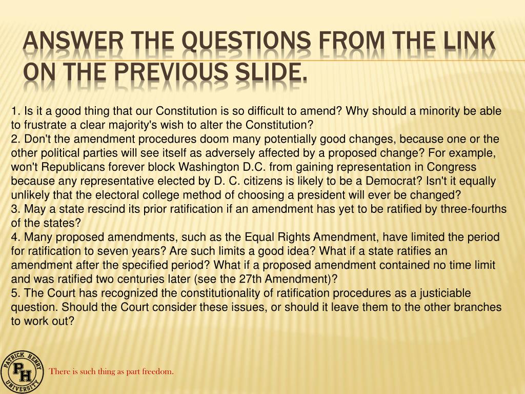 Answer the Questions from the Link on the Previous Slide. 1. Is it a good thing that our Constitution is so difficult to amend? Why should a minority be able to frustrate a clear majority's wish to alter the Constitution? 2. Don't the amendment procedures doom many potentially good changes, because one or the other political parties will see itself as adversely affected by a proposed change? For example, won't Republicans forever block Washington D.C. from gaining representation in Congress because any representative elected by D. C. citizens is likely to be a Democrat? Isn't it equally unlikely that the electoral college method of choosing a president will ever be changed? 3. May a state rescind its prior ratification if an amendment has yet to be ratified by three-fourths of the states? 4. Many proposed amendments, such as the Equal Rights Amendment, have limited the period for ratification to seven years? Are such limits a good idea? What if a state ratifies an amendment after the specified period? What if a proposed amendment contained no time limit and was ratified two centuries later (see the 27th Amendment)? 5. The Court has recognized the constitutionality of ratification procedures as a justiciable question. Should the Court consider these issues, or should it leave them to the other branches to work out?
