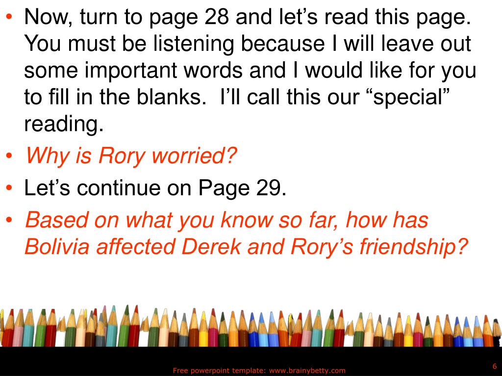 Now, turn to page 28 and let’s read this page. You must be listening because I will leave out some important words and I would like for you to fill in the blanks. I’ll call this our “special” reading. • Why is Rory worried? • Let’s continue on Page 29. • Based on what you know so far, how has Bolivia affected Derek and Rory’s friendship? Free powerpoint template: www.brainybetty.com