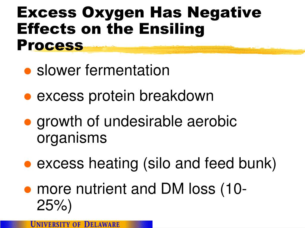 Excess Oxygen Has Negative Effects on the Ensiling Process • slower fermentation • excess protein breakdown • growth of undesirable aerobic organisms • excess heating (silo and feed bunk) • more nutrient and DM loss (10-25%)