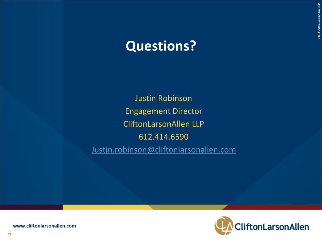 Questions? Justin Robinson Engagement Director CliftonLarsonAllen LLP 612.414.6590 Justin.robinson@cliftonlarsonallen.com