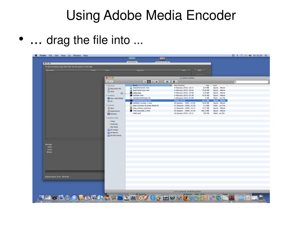 Using Adobe Media Encoder. Using Adobe Media Encoder. Adobe Media Encoder can be used to convert media files from one format to another For example, we can use it to compress our .mov files into the .flv format. Using Adobe Media Encoder.