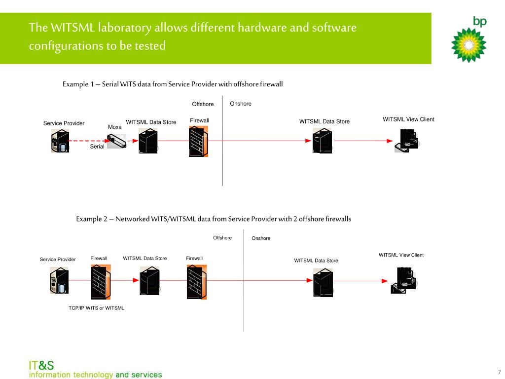 Onshore Offshore Offshore Onshore WITSML View Client WITSML View Client Firewall WITSML Data Store Firewall Firewall Service Provider WITSML Data Store WITSML Data Store WITSML Data Store Service Provider Moxa Serial TCP/IP WITS or WITSML The WITSML laboratory allows different hardware and software configurations to be tested Example 1 – Serial WITS data from Service Provider with offshore firewall Example 2 – Networked WITS/WITSML data from Service Provider with 2 offshore firewalls