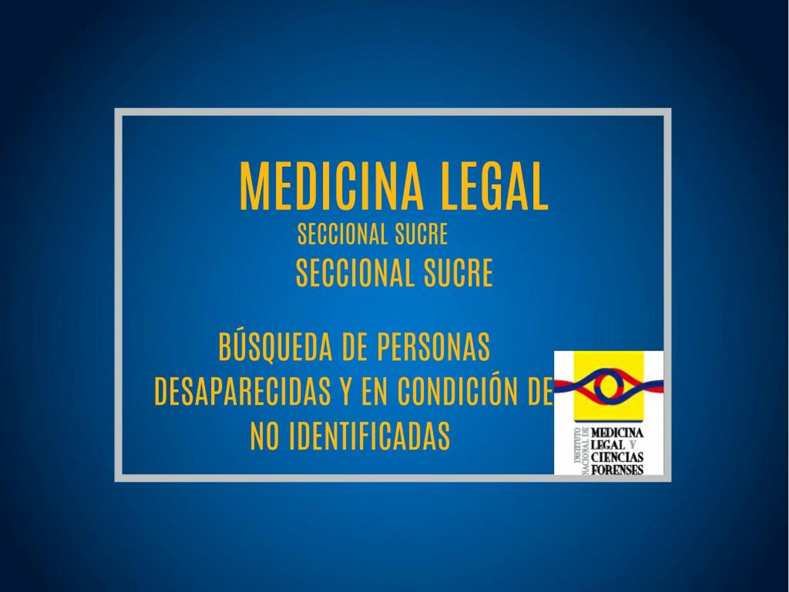 MEDICINA LEGAL MEDICINA LEGAL SECCIONAL SUCRE SECCIONAL SUCRE BÚSQUEDA DE PERSONAS DESAPARECIDAS Y EN CONDICIÓN DE NO IDENTIFICADAS