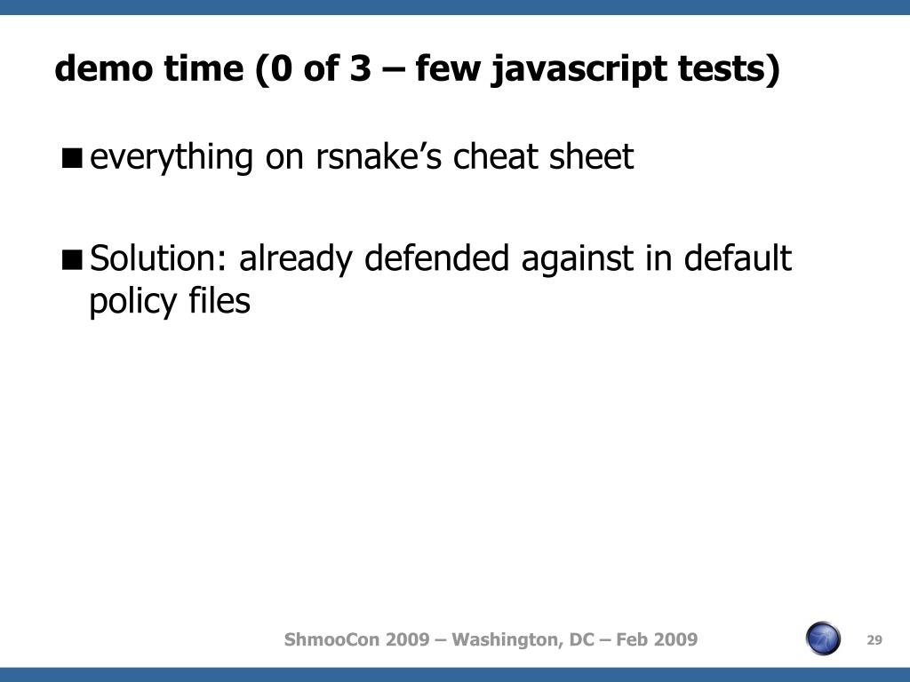 demo time (0 of 3 – few javascript tests) • everything on rsnake’s cheat sheet • Solution: already defended against in default policy files