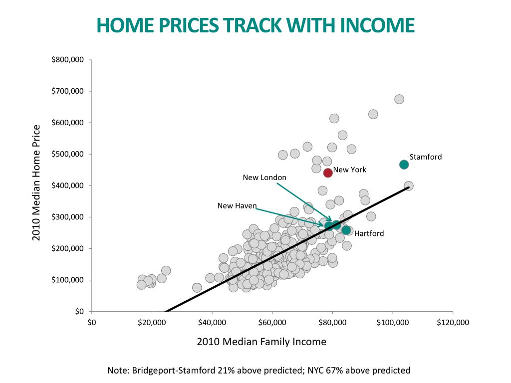 HOME PRICES TRACK WITH INCOME 2010 Median Home Price 2010 Median Family Income Note: Bridgeport-Stamford 21% above predicted; NYC 67% above predicted