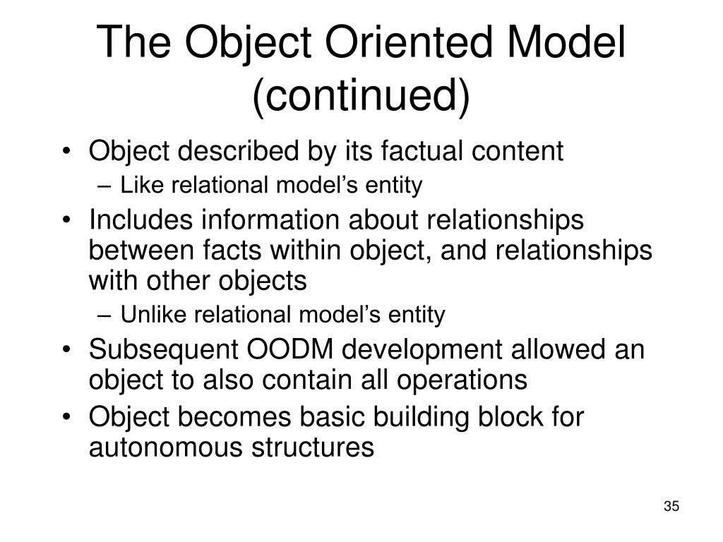 The Object Oriented Model (continued) • Object described by its factual content • Like relational model’s entity • Includes information about relationships between facts within object, and relationships with other objects • Unlike relational model’s entity • Subsequent OODM development allowed an object to also contain all operations • Object becomes basic building block for autonomous structures