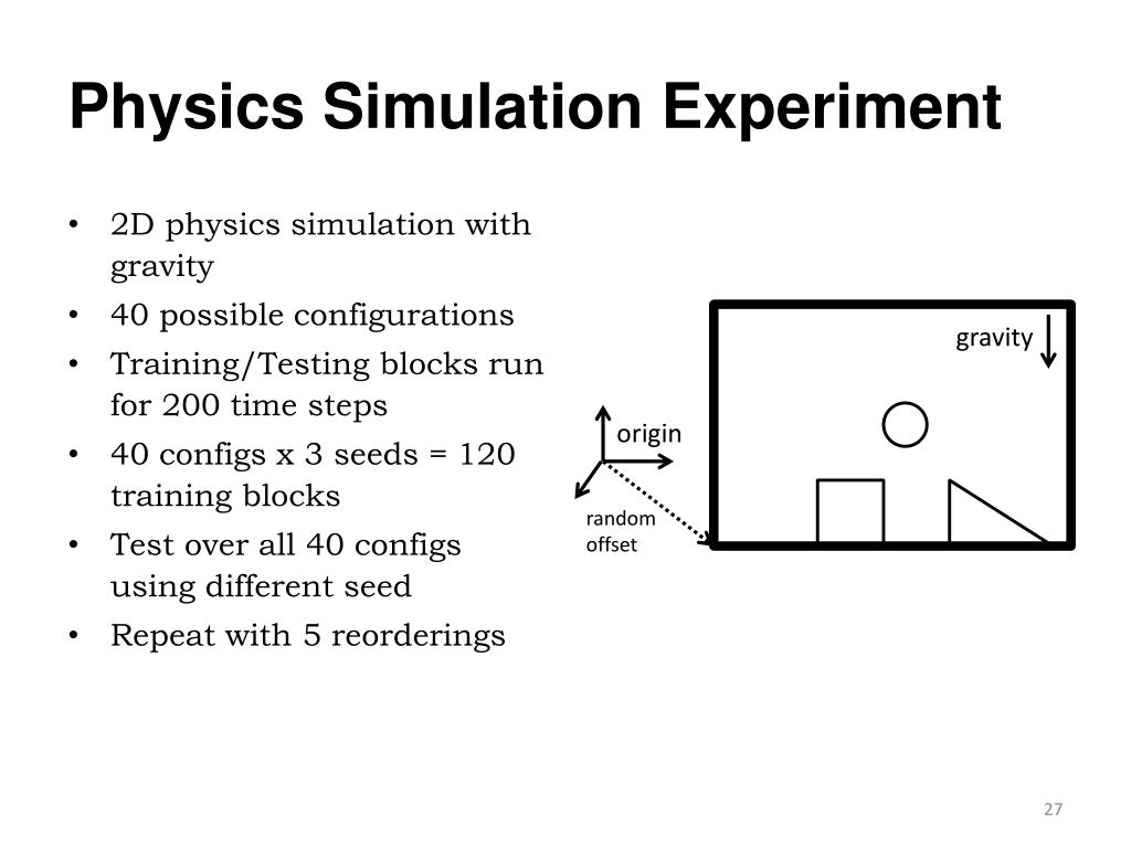 Physics Simulation Experiment • 2D physics simulation with gravity • 40 possible configurations • Training/Testing blocks run for 200 time steps • 40 configs x 3 seeds = 120 training blocks • Test over all 40 configs using different seed • Repeat with 5 reorderings gravity origin random offset