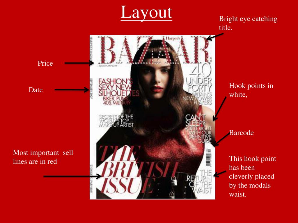 Magazine cover . Lauren Hookings. Layout. Bright eye catching title. . Price. Hook points in white,. Date. Barcode. Most important sell lines are in red. This hook point has been cleverly placed by the modals waist. Use of Text: Colour and font Choice. The theme of the magazine is