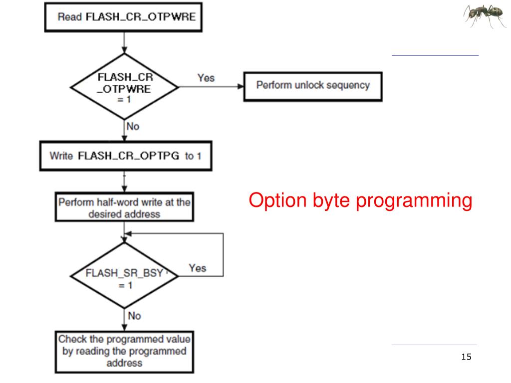 Flash memory interface register Bit 6 STRT: Start This bit triggers an ERASE operation when set. This bit is set only by software and reset when the BSY bit is reset. Bit 5 OPTER: Option byte erase Option byte erase chosen. Bit 4 OPTPG: Option byte programming Option byte programming chosen. Bit 3 Reserved, must be kept cleared. Bit 2 MER: Mass erase Erase of all user pages chosen. Bit 1 PER: Page erase Page Erase chosen. Bit 0 PG: Programming Flash programming chosen. Bit 9 OPTWRE: Option bytes write enable When set, the option bytes can be programmed. This bit is set on writing the correct key sequence to the FLASH_OPTKEYR register. This bit can be reset by software Bit 8 Reserved, must be kept cleared. Bit 7 LOCK: Lock Write to 1 only. When it is set, it indicates that the FPEC and FLASH_CR are locked. This bit is reset by hardware after detecting the unlock sequence. In the event of unsuccessful unlock operation, this bit remains set until the next reset.