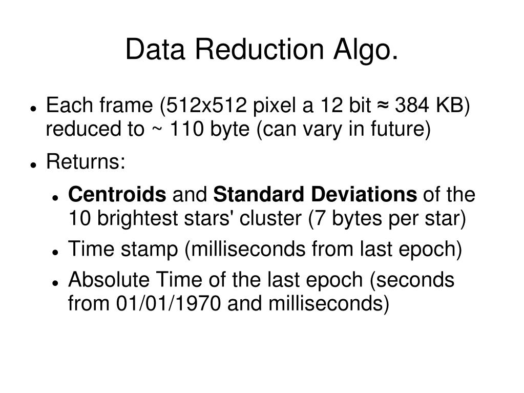 Data Reduction Algo. • Each frame (512x512 pixel a 12 bit ≈ 384 KB) reduced to ~ 110 byte (can vary in future) • Returns: • Centroids and Standard Deviations of the 10 brightest stars' cluster (7 bytes per star) • Time stamp (milliseconds from last epoch) • Absolute Time of the last epoch (seconds from 01/01/1970 and milliseconds)
