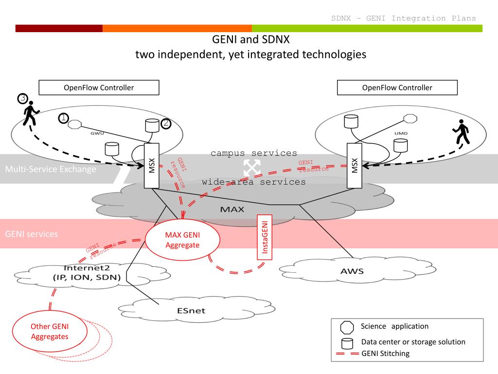 SDNX – GENI Integration Plans 2 3 1 GWU UMD GENI and SDNX two independent, yet integrated technologies OpenFlow Controller OpenFlow Controller campus services Multi-Service Exchange GENI resource MSX MSX MAX GENI resource wide-area services AWS GENI services MAX GENI Aggregate Internet2 (IP, ION, SDN) InstaGENI GENI resource ESnet Scienceapplication Other GENI Aggregates Other GENI Aggregates Other GENI Aggregates Data center or storage solution GENI Stitching