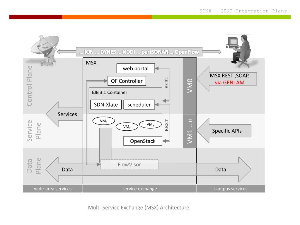 Control Plane SDNX – GENI Integration Plans Service Plane Data Plane … ION … DYNES … NDDI … perfSONAR … OpenFlow MSX web portal MSX REST ,SOAP, via GENI AM OF Controller REST VM0 EJB 3.1 Container SDN-Xlate scheduler Services VM1 Specific APIs VMn REST VM2 VM1 .. n OpenStack Data Data FlowVisor wide-area services service exchange campus services Multi-Service Exchange (MSX) Architecture