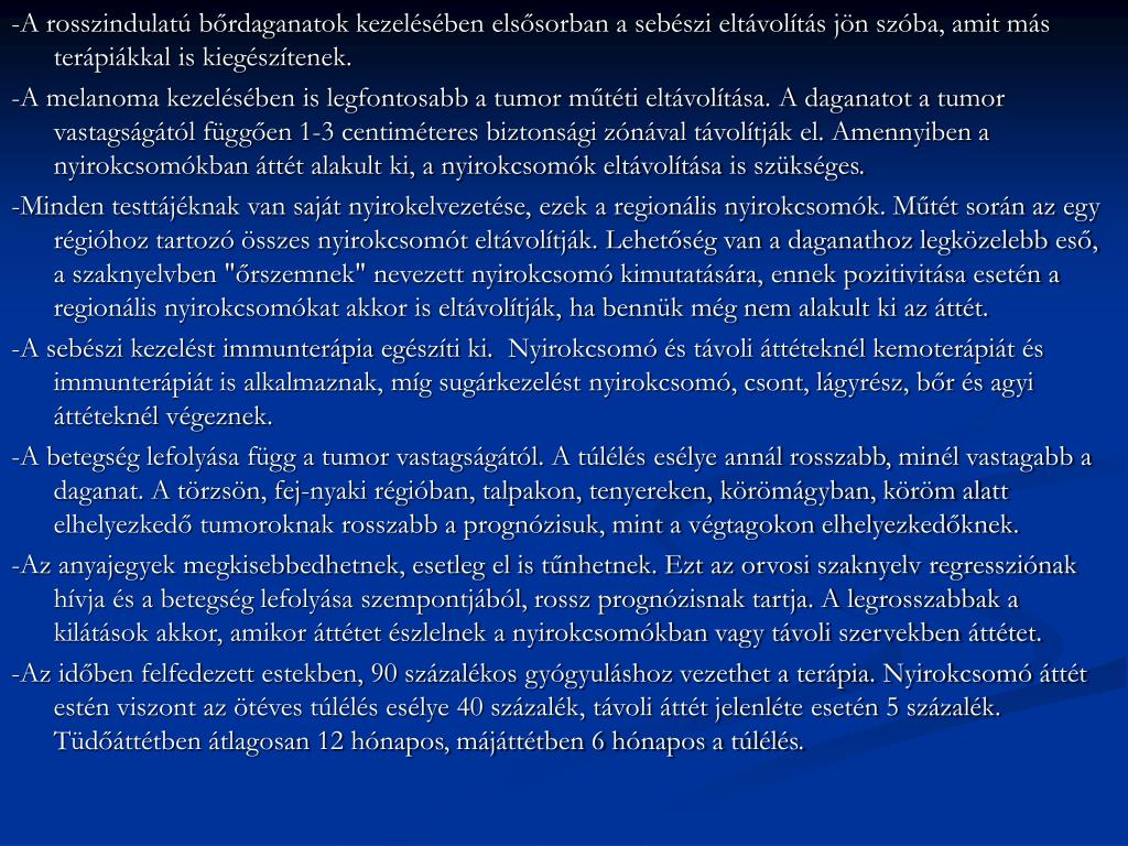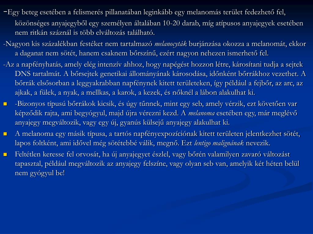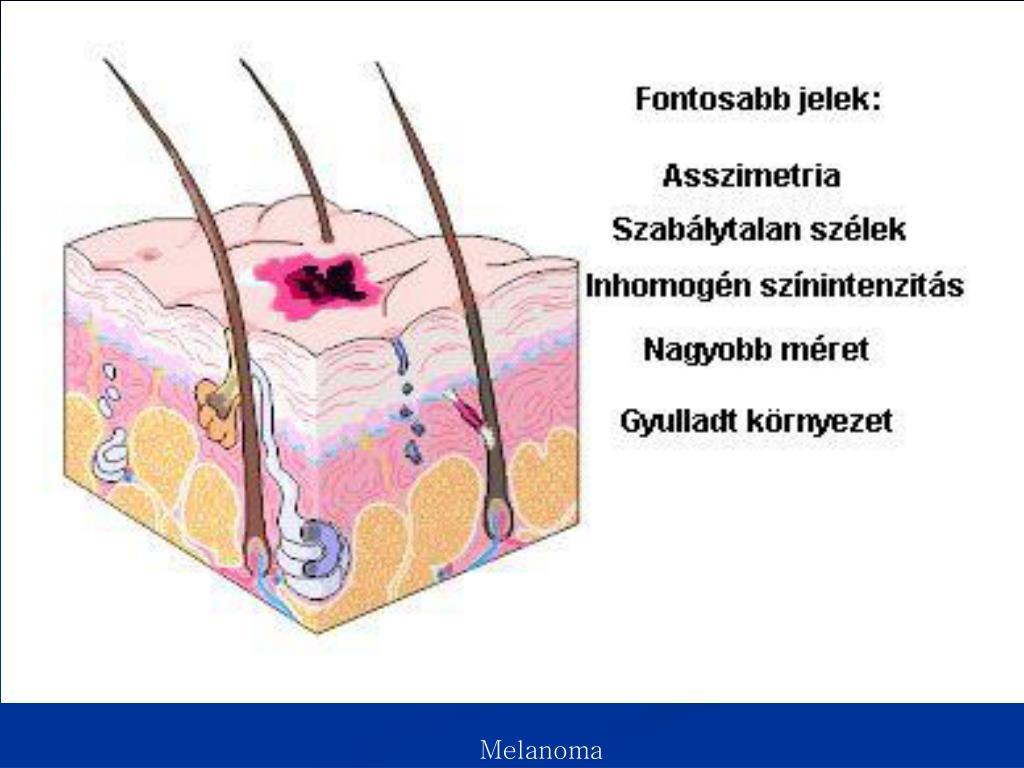-A daganatos betegek 5 éves követése a bőrdaganatok esetén is szükséges, részben a már eltávolított elváltozás ellenőrzése, részben az esetleges új daganatok kiszűrése céljából. Ez az első évben 3-6 havonta, második évben félévente, harmadik évtől évente történik. -A melanoma a festéktartalmú sejtek rosszindulatú burjánzása. A bőrből kiinduló rosszindulatú daganatok 2-3 százalékát alkotja, a leggyakoribb daganatok listáján a nyolcadik helyen áll. A melanoma rendkívül rosszindulatú daganattípus. -A melanoma a nyirokcsomókba, belső szervekbe, májba, agyba, tüdőbe, csontokba korán ad áttétet. -Késői felismerés esetén a betegek fele szervi áttétben meghal, korai felismerésekor ez az arány 10 százalék körüli értékre csökkenthető. -A melanomás betegek száma az utóbbi évtizedekben ijesztően növekszik, amit a környezeti hatásokkal, elsősorban a túlzott napozással magyarázunk. -Nagyon fontos a közönséges anyajegy, az atípusos anyajegy és a melanoma elkülönítése. Ehhez különböző szempontok segítséget nyújthatnak, de biztos diagnózis csak bőrgyógyászati vizsgálat után, egy speciális nagyítóval végzett megtekintés és szövettani vizsgálat (biopszia) alapján mondható ki. -A közönséges anyajegy határa éles, az atípusos anyajegy és melanoma esetében az elváltozás határa szabálytalan, elmosódó. -A közönséges anyajegy és a melanoma gyakoribb azokon a bőrfelületeken, amelyeket több napsütés ér, az atípusos anyajegy esetében ez nem figyelhető meg, sőt, a ruhával fedett testfelszíneken több van belőlük. -A közönséges anyajegy gyermekkorban és fiatal felnőttkorban jelenik meg, az atípusos forma és a melanoma előfordulási gyakorisága az életkor előrehaladtával nő.